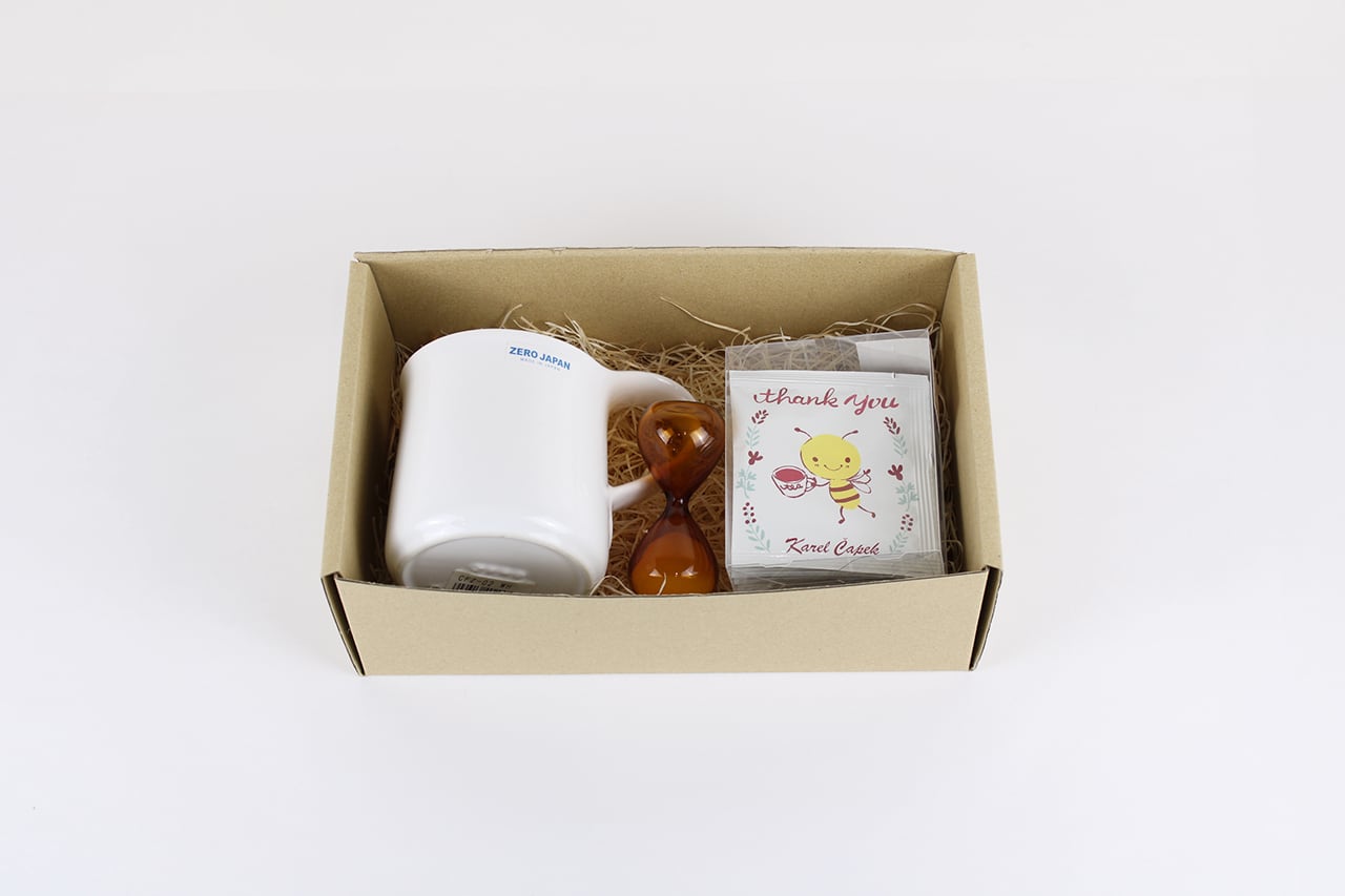 マグカップ、紅茶、砂時計がセットになった、ミニマルシェオリジナル「ティータイムギフトセット」です。