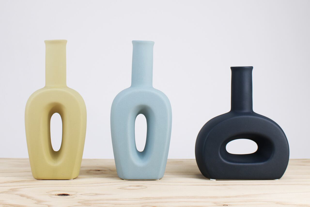 胴体に穴が開いたり、口が細長く伸びていたりと磁器にしかできない個性的なデザインのフラワーベース。
