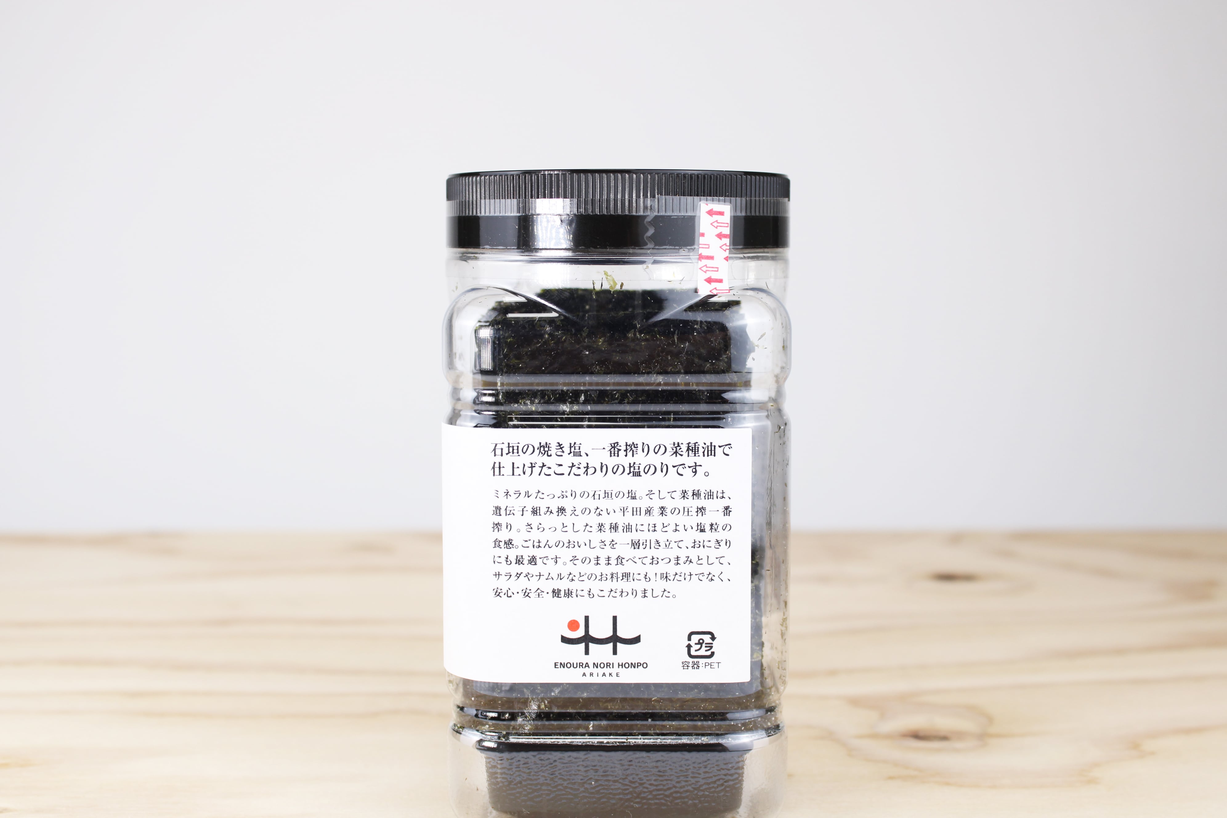 塩のり~ミネラルたっぷりの石垣の塩と、圧縮一番搾り製法の菜種油を贅沢に使用した塩海苔です。さらっとした菜種油にほどよい塩粒の食感が、いつものごはんの美味しさを一層引き立てます。おにぎりやサラダ、ナムルなどのお料理にも使えます。自然素材の調和が生み出すおいしさをご堪能いただけます。