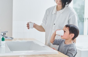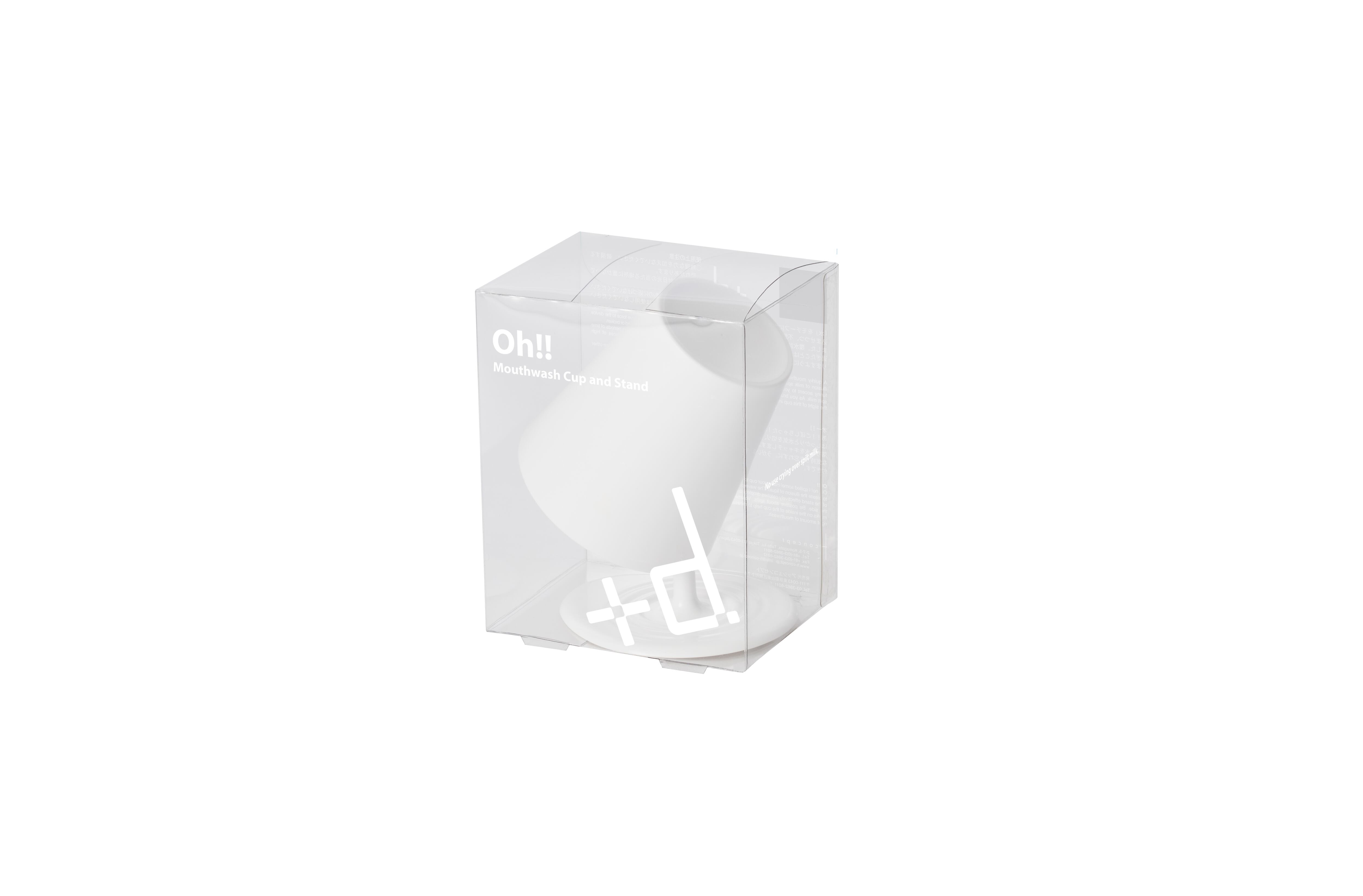 コップをスタンドに被せると、液体がこぼれているように見えるうがいコップとスタンドです。「覆水盆に返らず」というメッセージがこめられています。