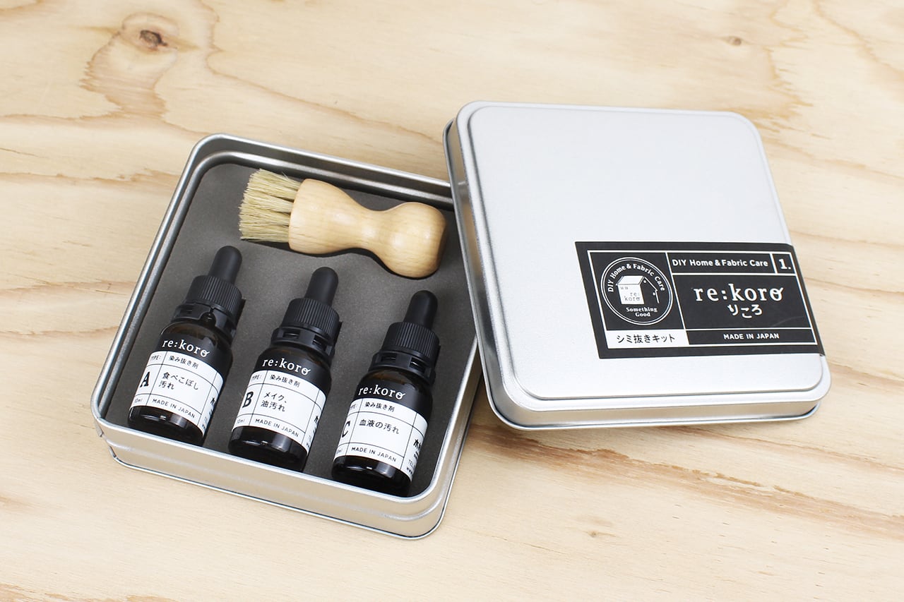 シミをつけた時にすぐ対応できるように、お家に常備しておきたくなる薬箱のような存在。それがre:koroです。